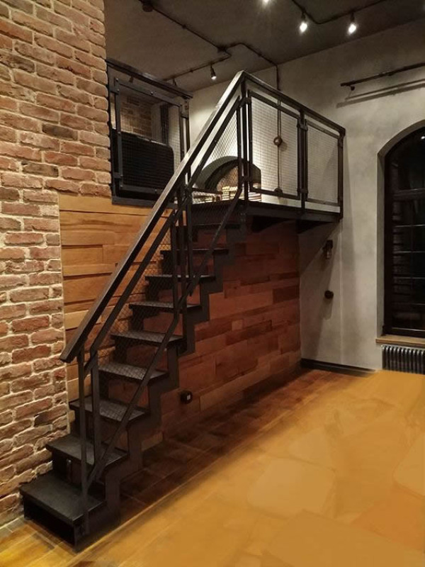 Лофт, как описывает Википедия, это хозяйственный чердак или верхняя часть здания промышленного назначения. Ограждение Лофт 5 как раз отображает наглядно этот вариант оформления интерьера в апартаментах. Если в помещении есть несколько уровней, которые хочется использовать по максимуму, то установка компактной лестницы со стильным ограждением – это выход из ситуации. Ограждение Лофт 5 – это комбинация геометрически правильных линий и фигур. В наклонной части ограждения, вдоль лестницы с высоким шагом ступеней, установлена две конструкции из металлических пластин, внутри которых зафиксирована сетка. В верхней части ограждения использованы несколько прямоугольников, внутри которых также встроена металлическая сетка. Элементы ограждения соединены между собой крепежными деталями, повторяющими стиль всего ограждения. Аккуратными акцентами на блоках ограждения выглядят шляпки крепежных болтов. Вдоль ограждения, на комфортной высоте, установлены перилла с гладкой поверхностью.